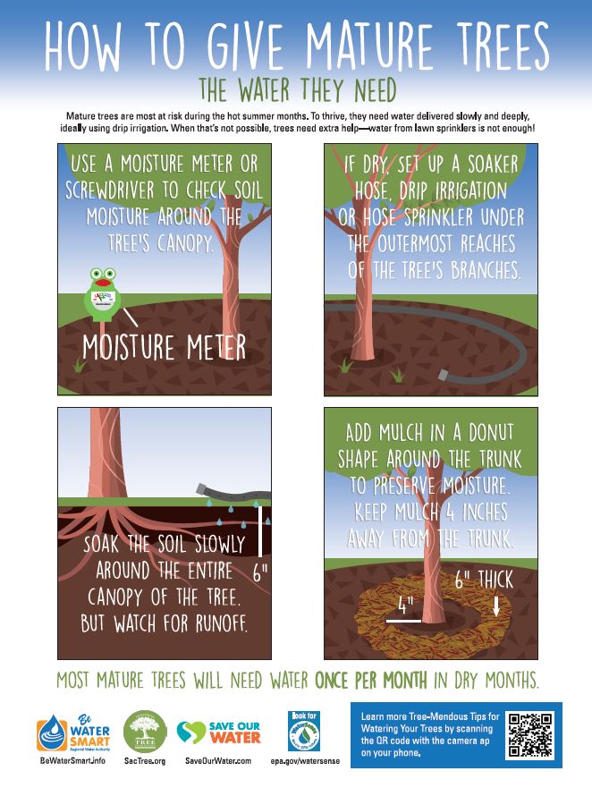 To preserve that moisture, make sure to mulch around trees. Use wood chips, shredded bark, or other organic material; it adds nutrients to the soil as well as maintains moisture and cooler soil temperatures.