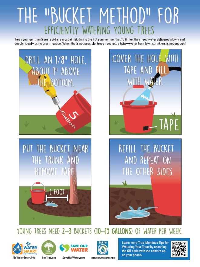“Take a 5-gallon bucket and drill a small, 1/8-inch hole in the bottom,” he explains. “Place the bucket near the tree and fill it with water. Do this a few times, rotating the bucket around the tree.”
